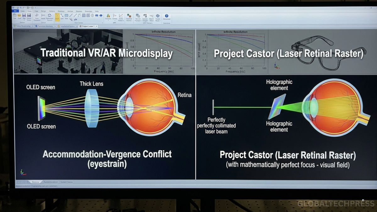 Normally, a display emits light outward, and your eye focuses on that glowing surface. Retinal projection bypasses the “surface” entirely. Instead of putting a tiny OLED screen in front of your eye (which causes eye strain and requires heavy lenses to focus), Project Castor reportedly uses microscopic, ultra-low-power lasers and micro-LEDs built into the frame of the glasses.